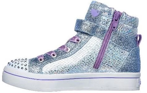 Shining style is worth shouting about when she wears the SKECHERS Twinkle Toes: Twi-Lites – Holla-Glam shoe. Metallic snake-emboss textured fabric and glitter finish fabric upper in a slip on casual light-up high top sneaker with stitching and overlay accents.